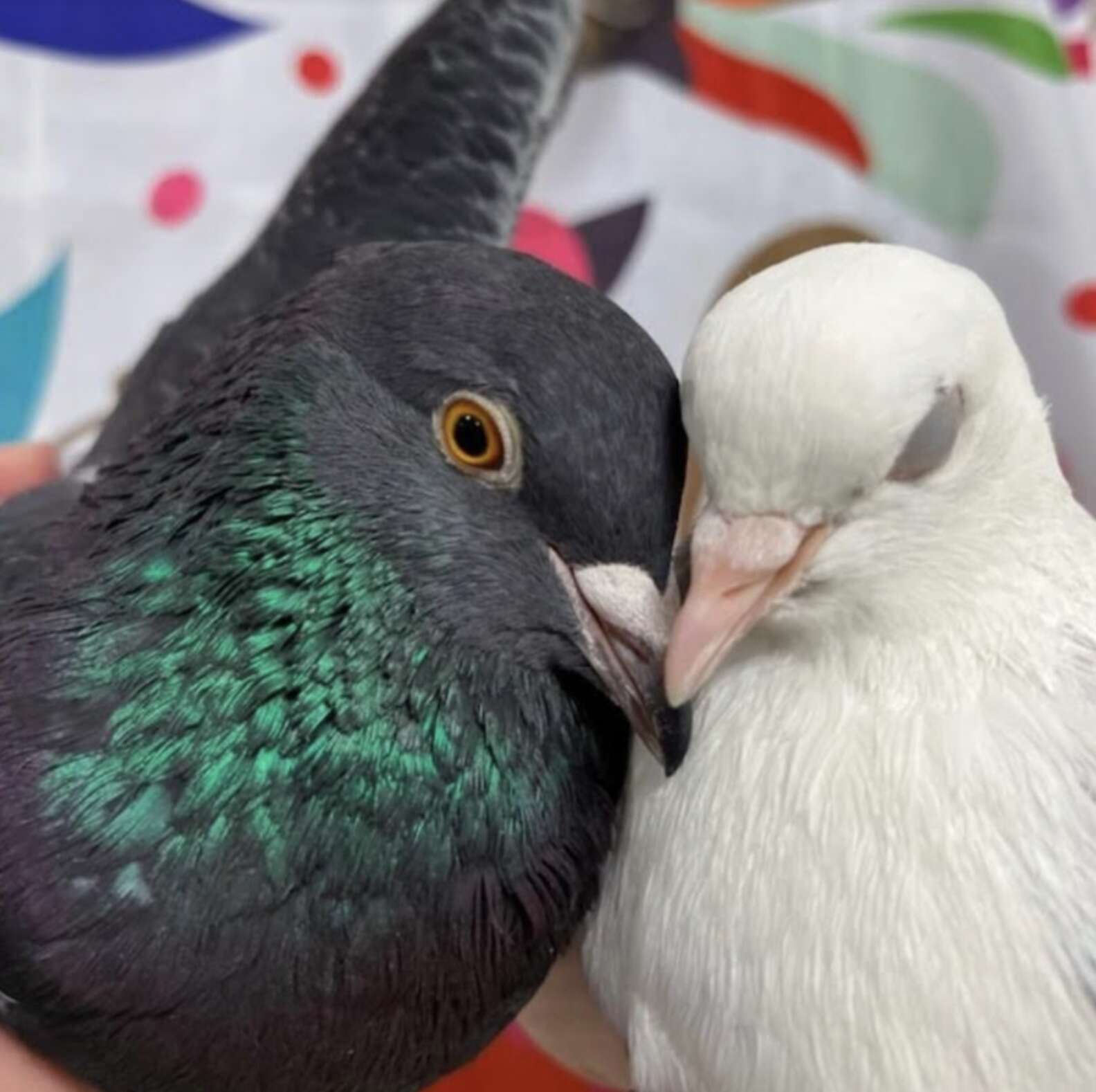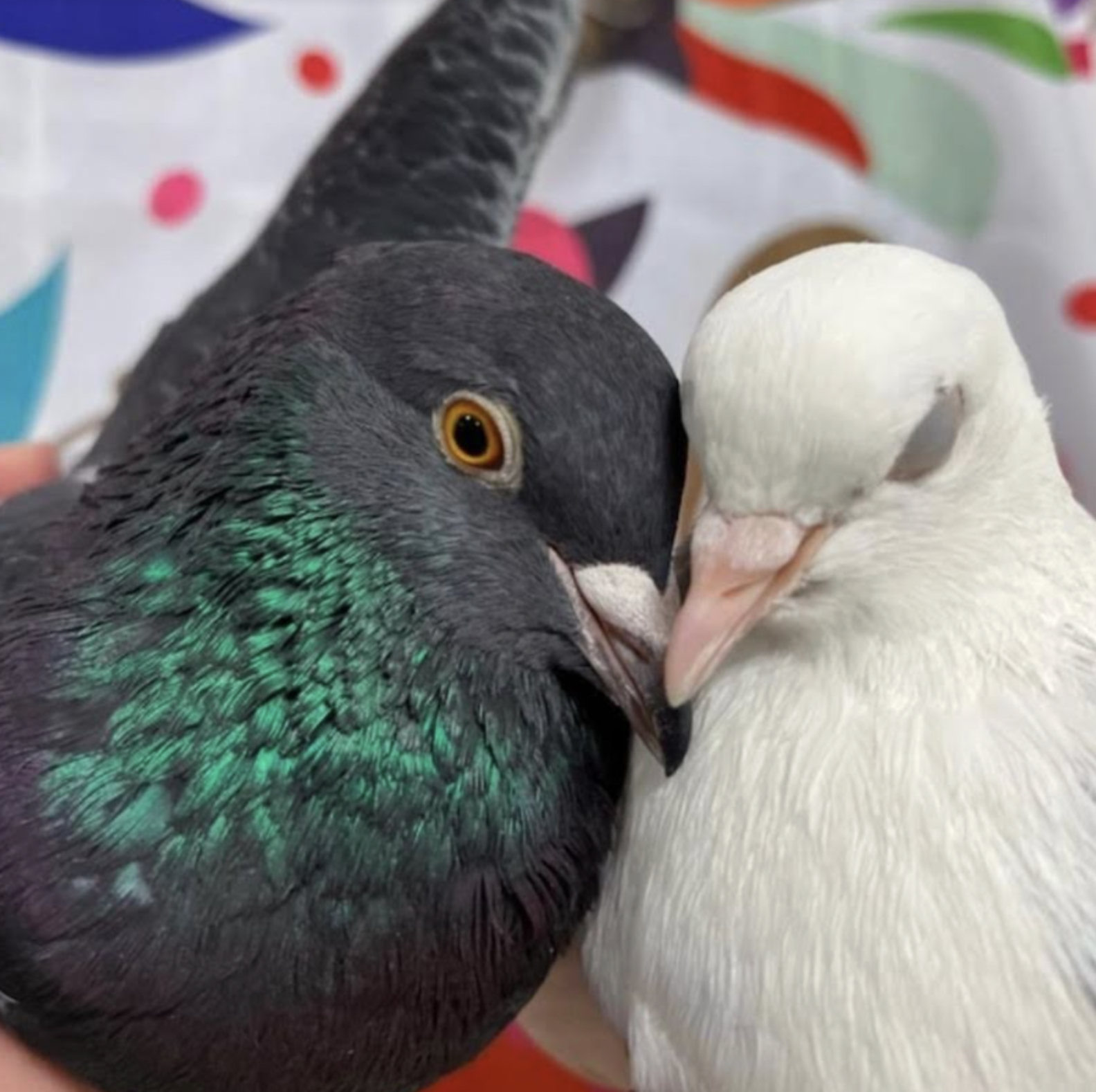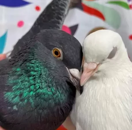 “Their foster mom noticed them starting to talk to each other while in their neighboring cages!” Sonnier said. “There were other rescued foster pigeons around too, but Taz and Rasta specifically were interested in each other and soon started flirting, which neither of them had done with any other pigeons!”
