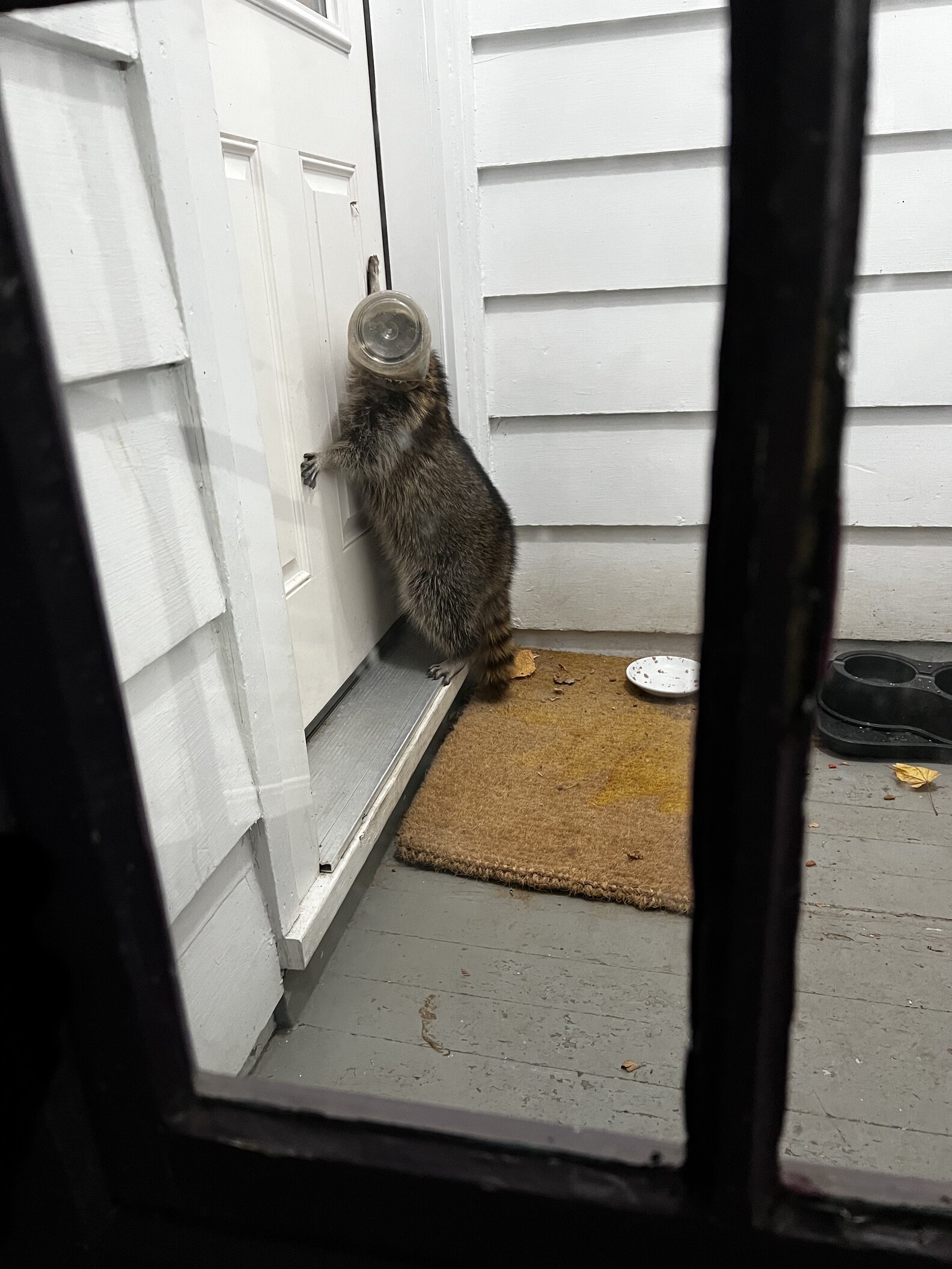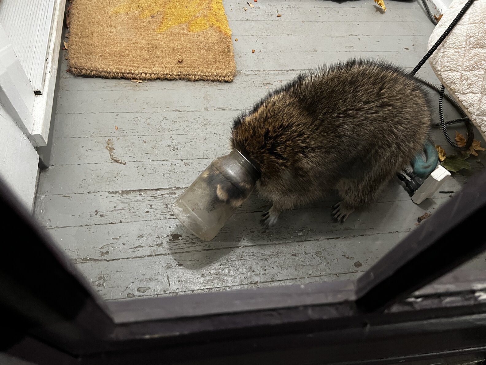 One evening, the family noticed an animal at their door who startled them at first. He definitely wasn’t a cat, but it was hard to tell what he might be at first — because he had a huge plastic jar stuck on his head.
