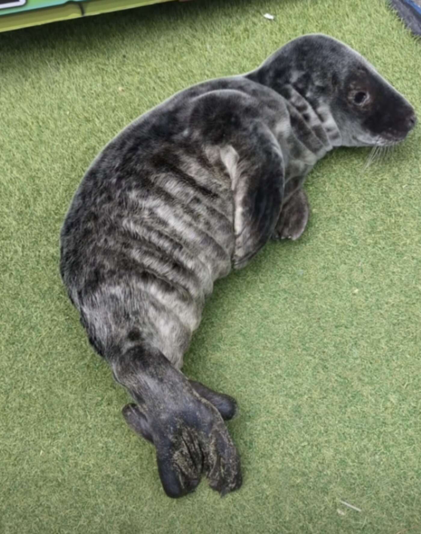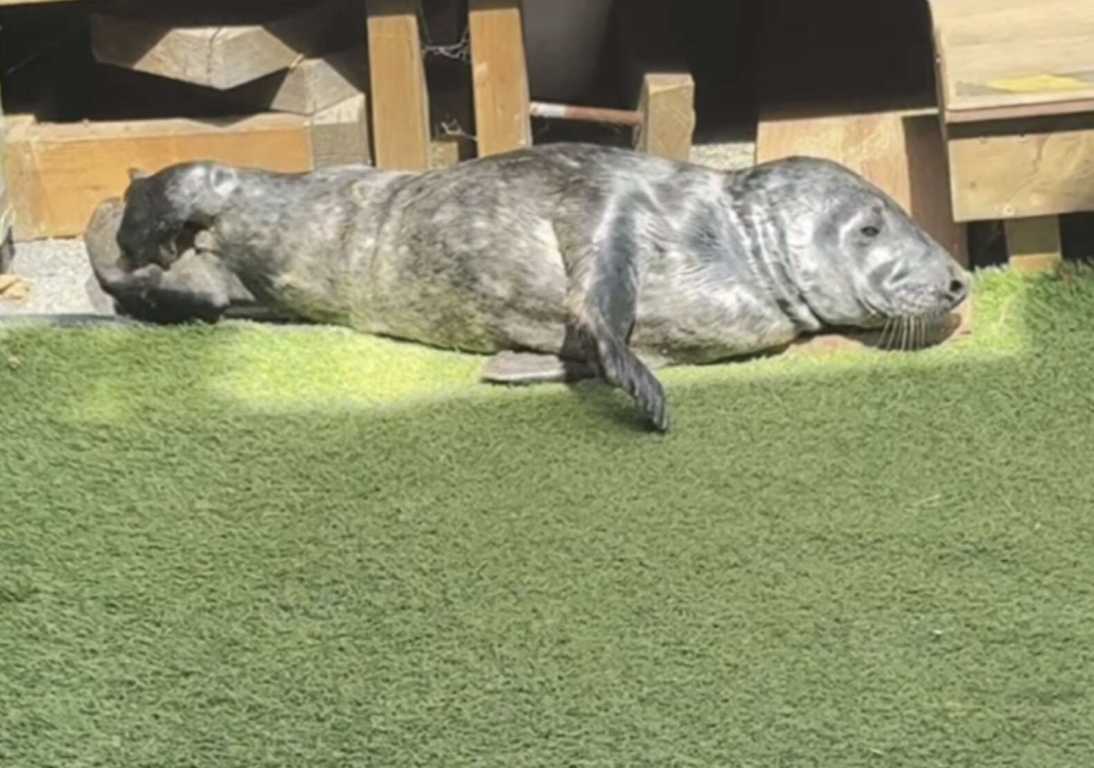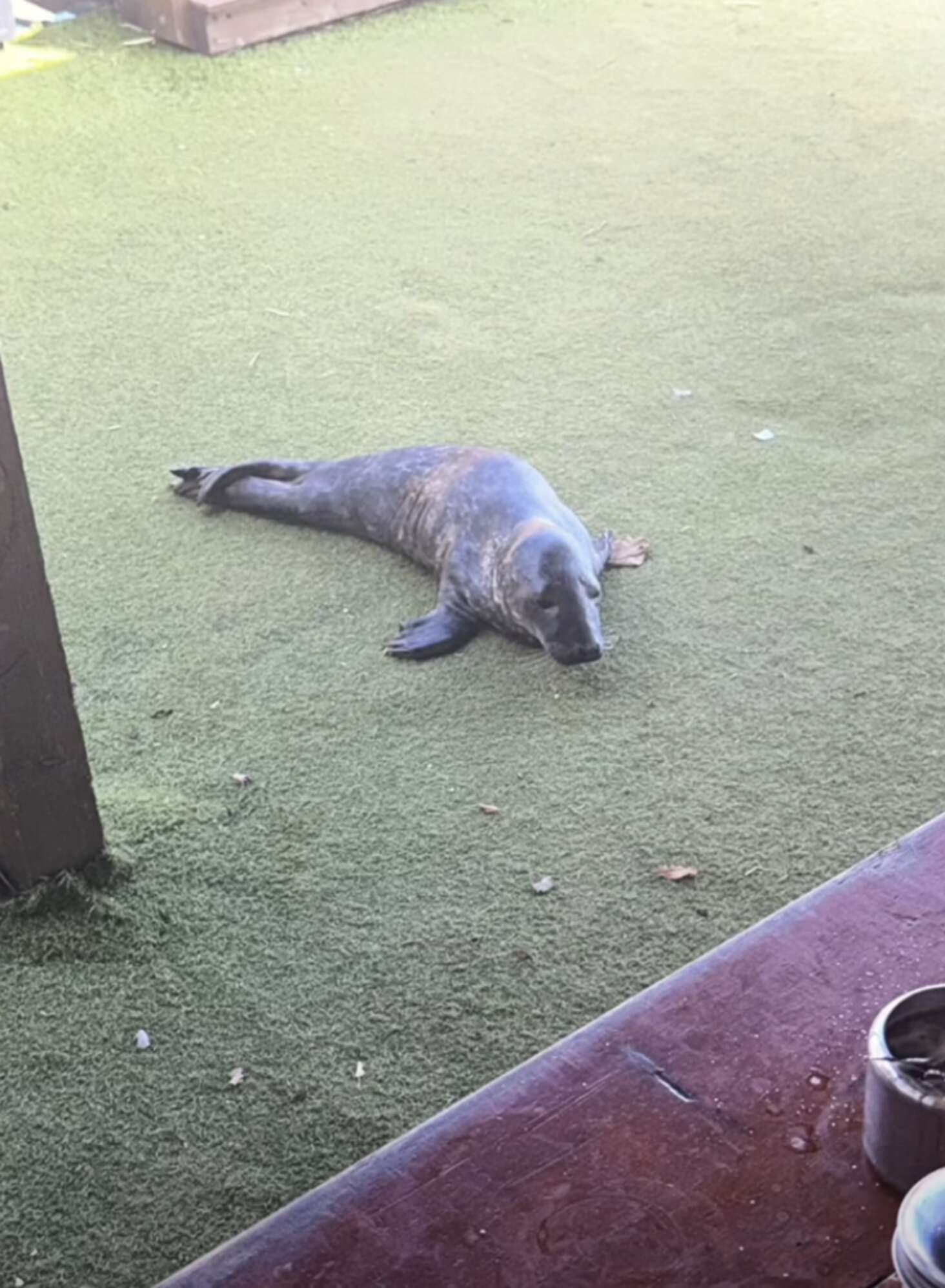 A young grey seal pup had wandered into the restaurant, perhaps looking for help. The tired seal inched his way across the cafe floor before falling asleep next to a bench.