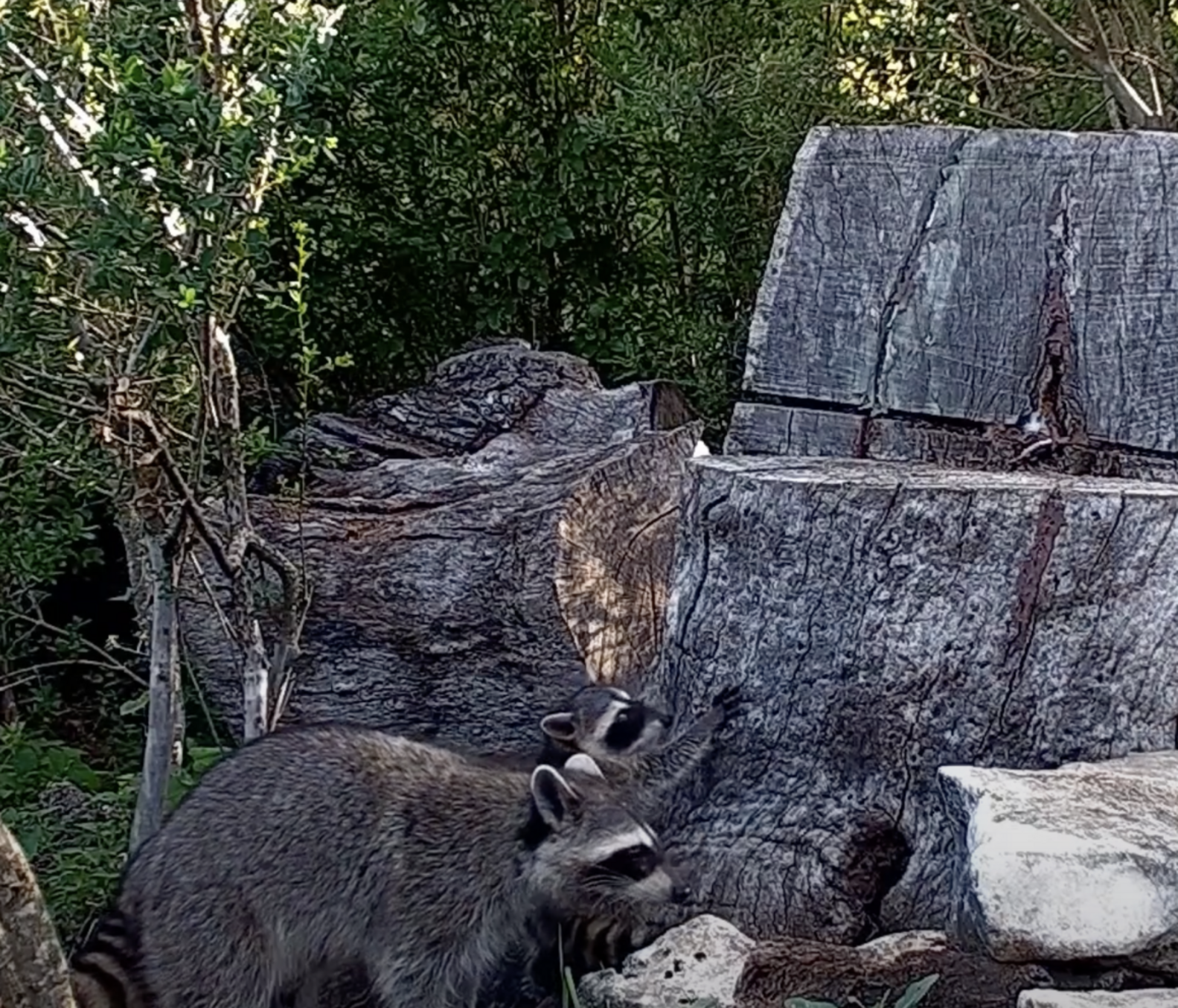 In the footage, a mother raccoon stumbles through the brush with her kit. She seems to be searching for a safe spot to hide him for the day so that she can forage for food and water. Eventually, the mama finds a hollow tree stump. She decides this is a suitable place for her baby, so she leaves him by the log and goes to run her errands.
