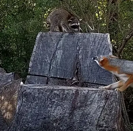 At first, the father fox hisses at the baby raccoon. But then, as if understanding the little kit means no harm, he decides to leave him alone.