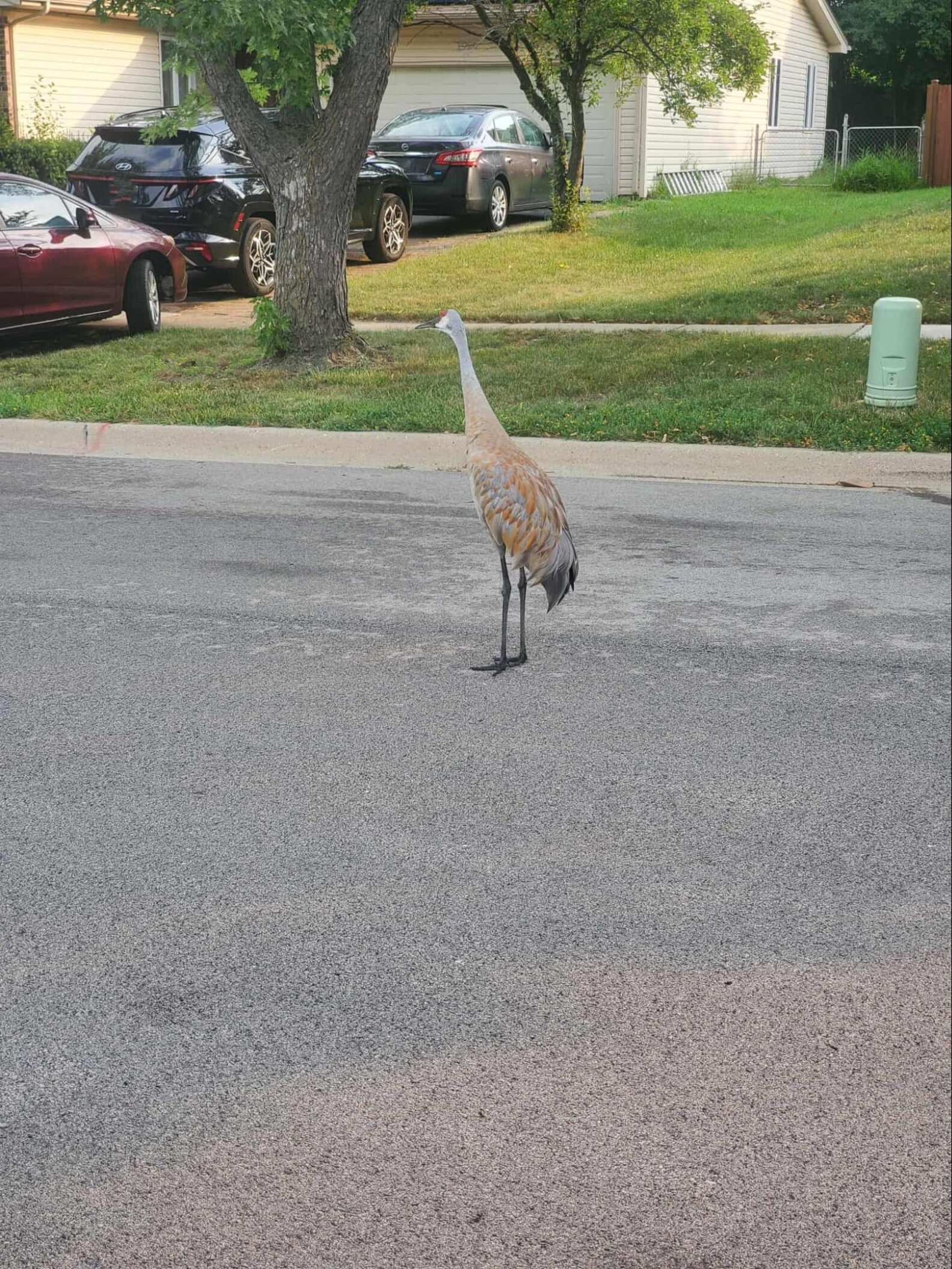 The sound was coming from a giant sandhill crane standing in the street. Concerned about the bird’s safety, she ran outside. “I motioned at him and said, ‘You better get out of the street,’” Schwager told The Dodo.