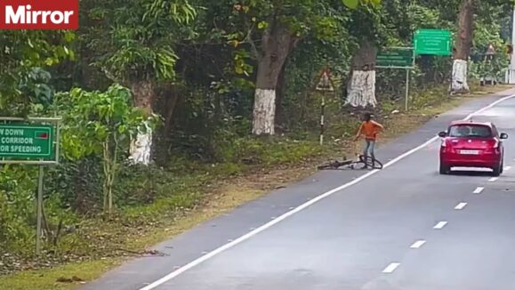 The man loses balance and falls but the leopard sprints back to the forest. The cyclist immediately turns back.