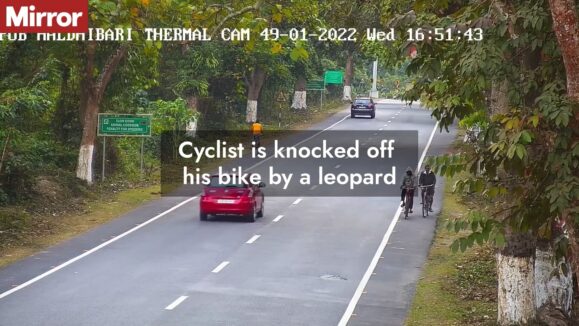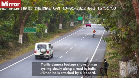 A video circulating on social media shows a leopard pouncing on a cyclist. According to news agency ANI, the incident took place at Kaziranga National Park in Assam and the video was captured by CCTV installed in the area. The video has been shared by several users, including Indian Forest Service (IFS) officials. As the minute-long clip begins, a man wearing an orange full sleeves sweater is seen riding a bicycle along a highway passing through a forest. Suddenly, a leopard leaps put from the bushes and charges at the man.