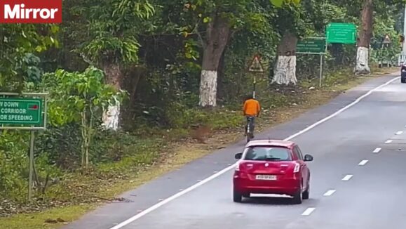 Footage shows the man cycling slowly along a road in Kaziranga National Park when he is attacked by the animal that emerges from the trees.