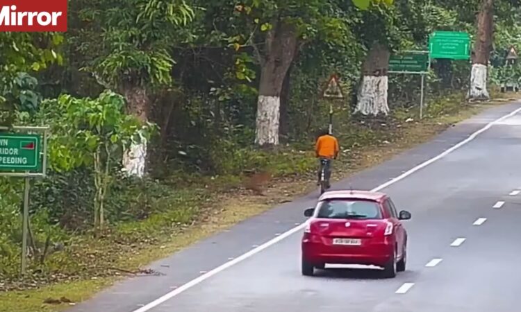 Footage shows the man cycling slowly along a road in Kaziranga National Park when he is attacked by the animal that emerges from the trees.