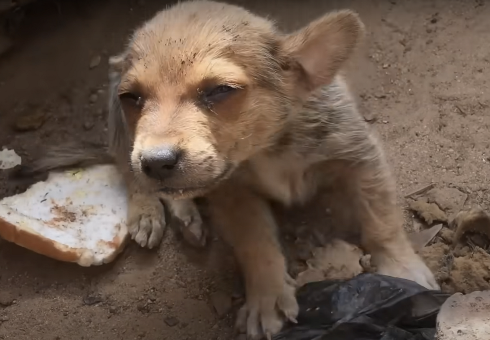 As she walked up to the tiny puppy, she noticed he was holding something in his mouth: a piece of bread that was almost bigger than he was. Sylvester was surprised to find that despite how exhausted, terrified and hungry he must have been, he was still happy to see her.