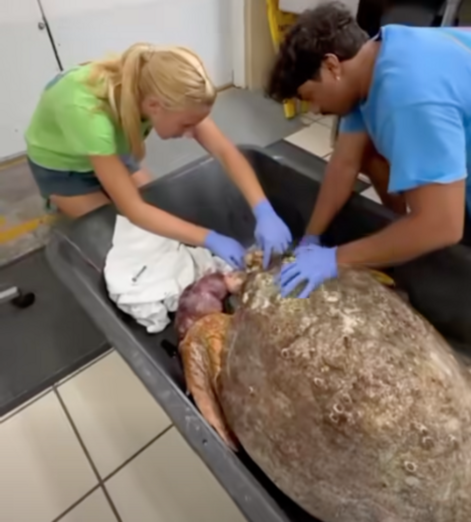 Staff met the fisherman at a dock and safely rushed Molly to The Turtle Hospital, where they disentangled her from the fishing line. The ailing turtle received fluids and antibiotics as staff wrapped her tumor and immediately flew in a vet who could remove it.