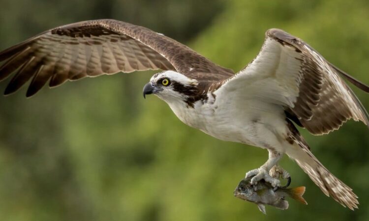 Ospreys rank among the birds that eat fish almost exclusively. In total, fish make up 99% of its diet. That said, they will occasionally eat small mammals or birds if readily available. They will eat almost any fish that they can catch, which includes all fish weighing less than 4.5 pounds. While hunting, ospreys rely on their keen vision to spot fish from their air. Upon sighting a target, an osprey will dive down and plunge its feet into the water. Depending on how deep the fish is, an osprey may fully submerge itself beneath the water surface. Upon catching a fish, most ospreys will carry their prey back to a spot where they can sit and eat it.