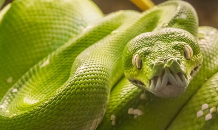 These pythons are nonvenomous and normally don’t pose a danger to humans. In the wild, these snakes will usually keep to themselves — but if they’re kept as pet snakes, inadequate enclosure size can change the facts and back them into attacking. And being nonvenomous doesn’t change the fact that these snakes have over 100 teeth. A bite from this snake can often result in the price of an emergency room bill. Enclosure size should always be a priority when keeping them as pet snakes, but green tree pythons should also only be kept by experienced handlers due to their complicated temperaments.