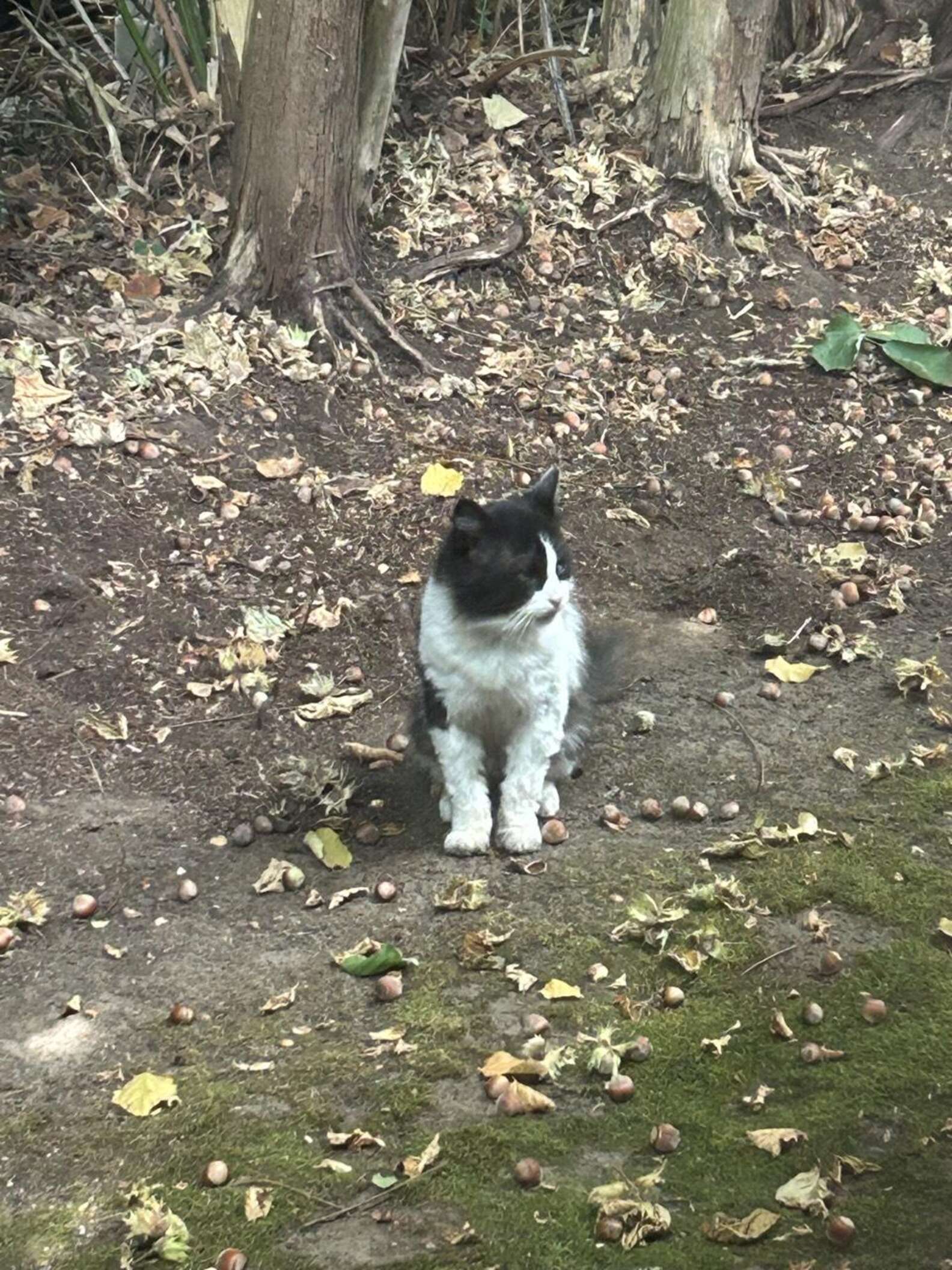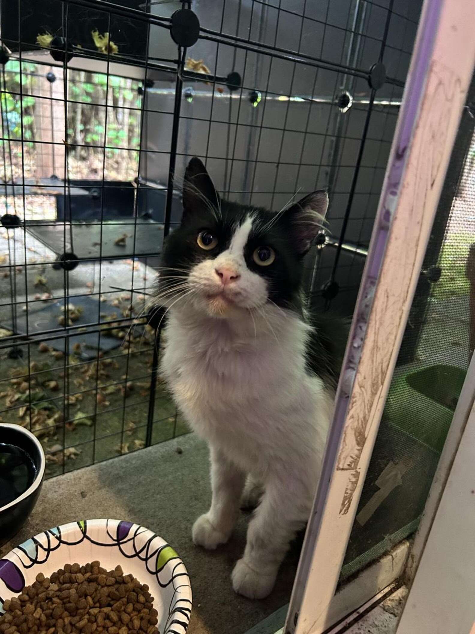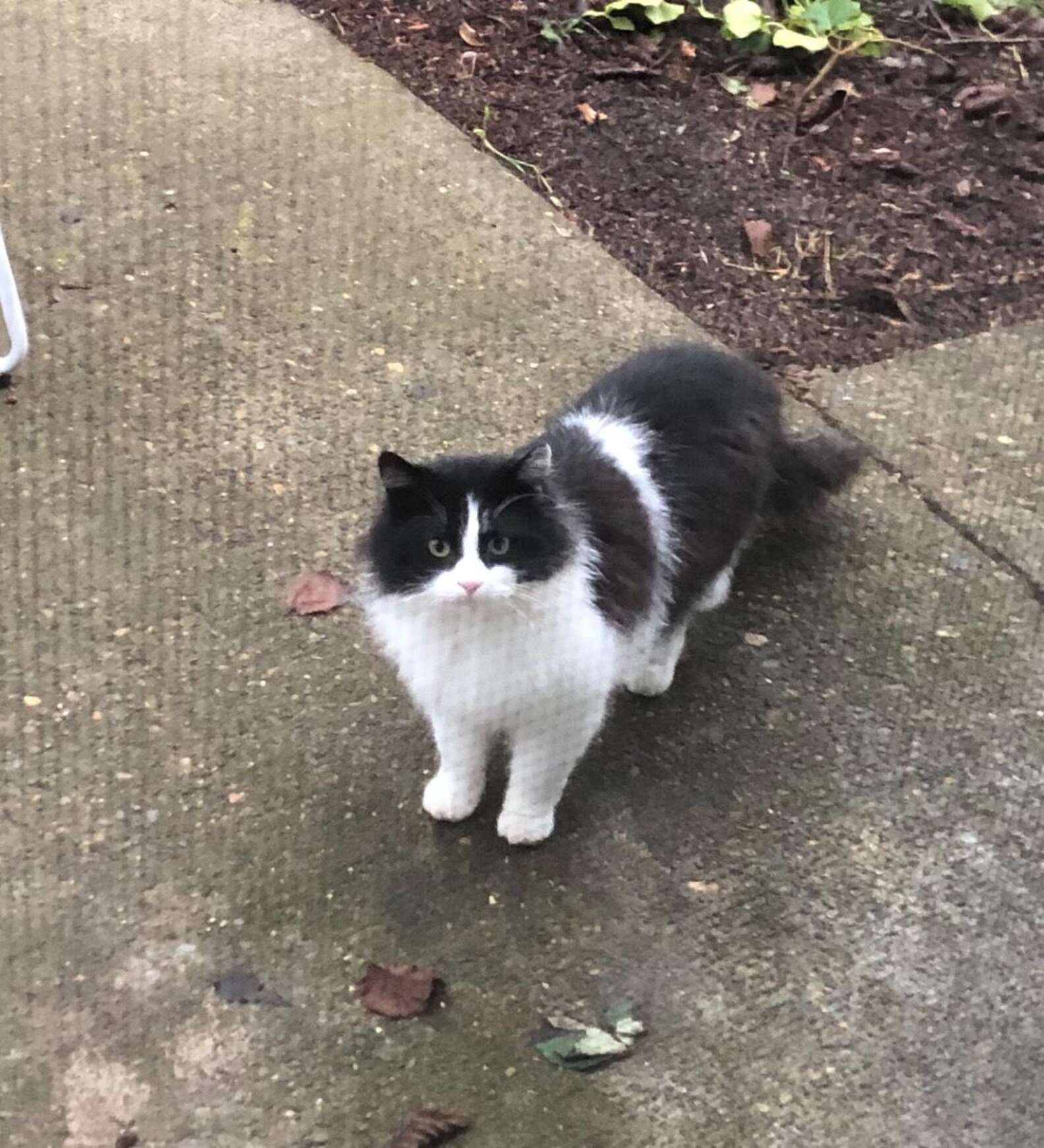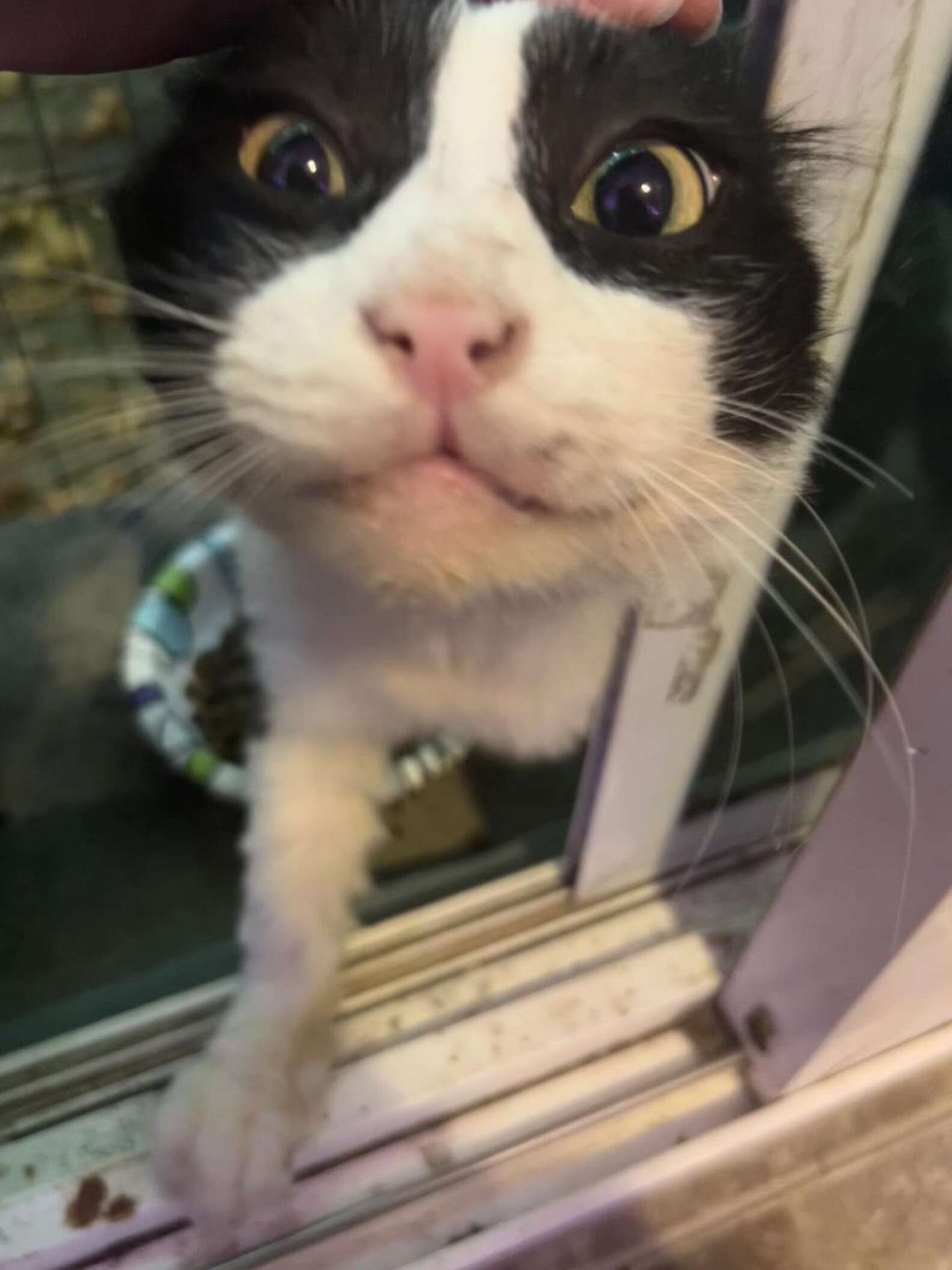 In January 2023, while living in another apartment up the road, a random black-and-white tomcat appeared at Eleanor’s back door looking for food. Every time she attempted to feed him, however, he’d run away. The only evidence she had of his visits was a video she recorded on her phone.