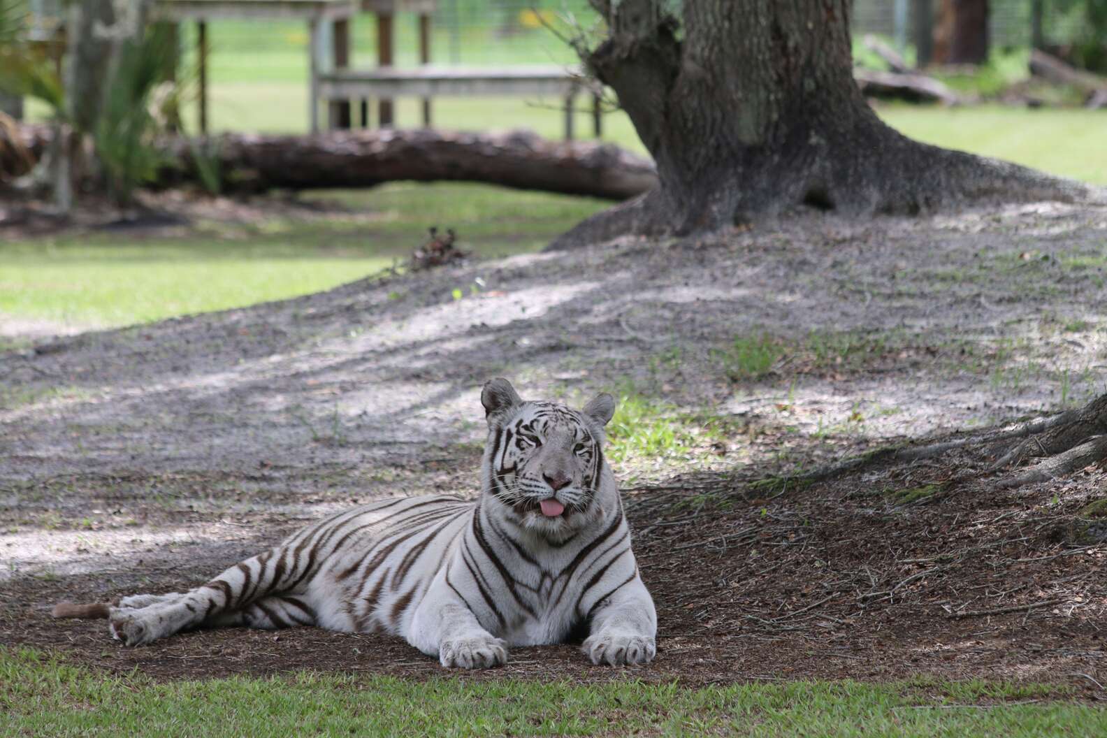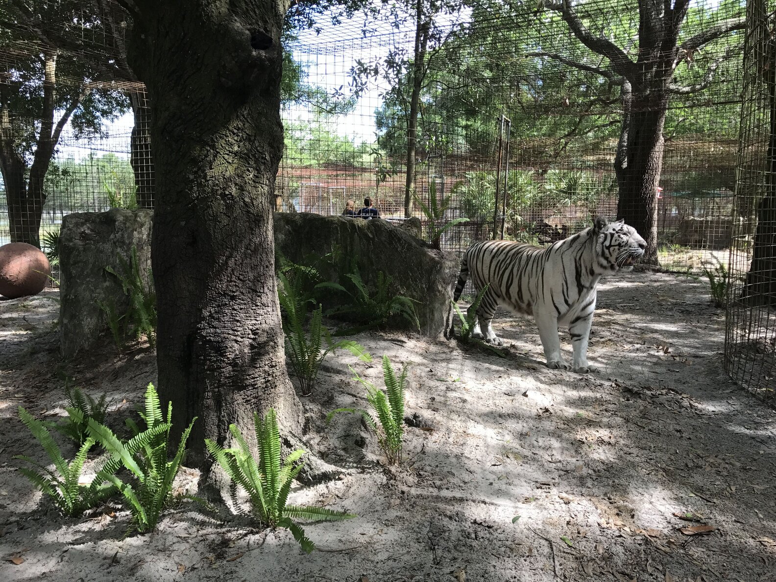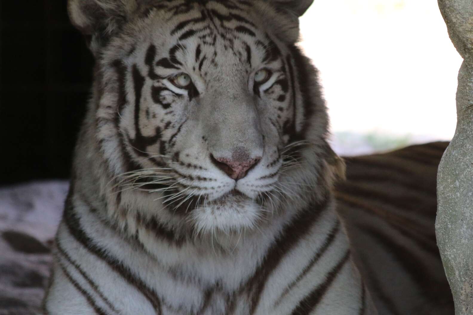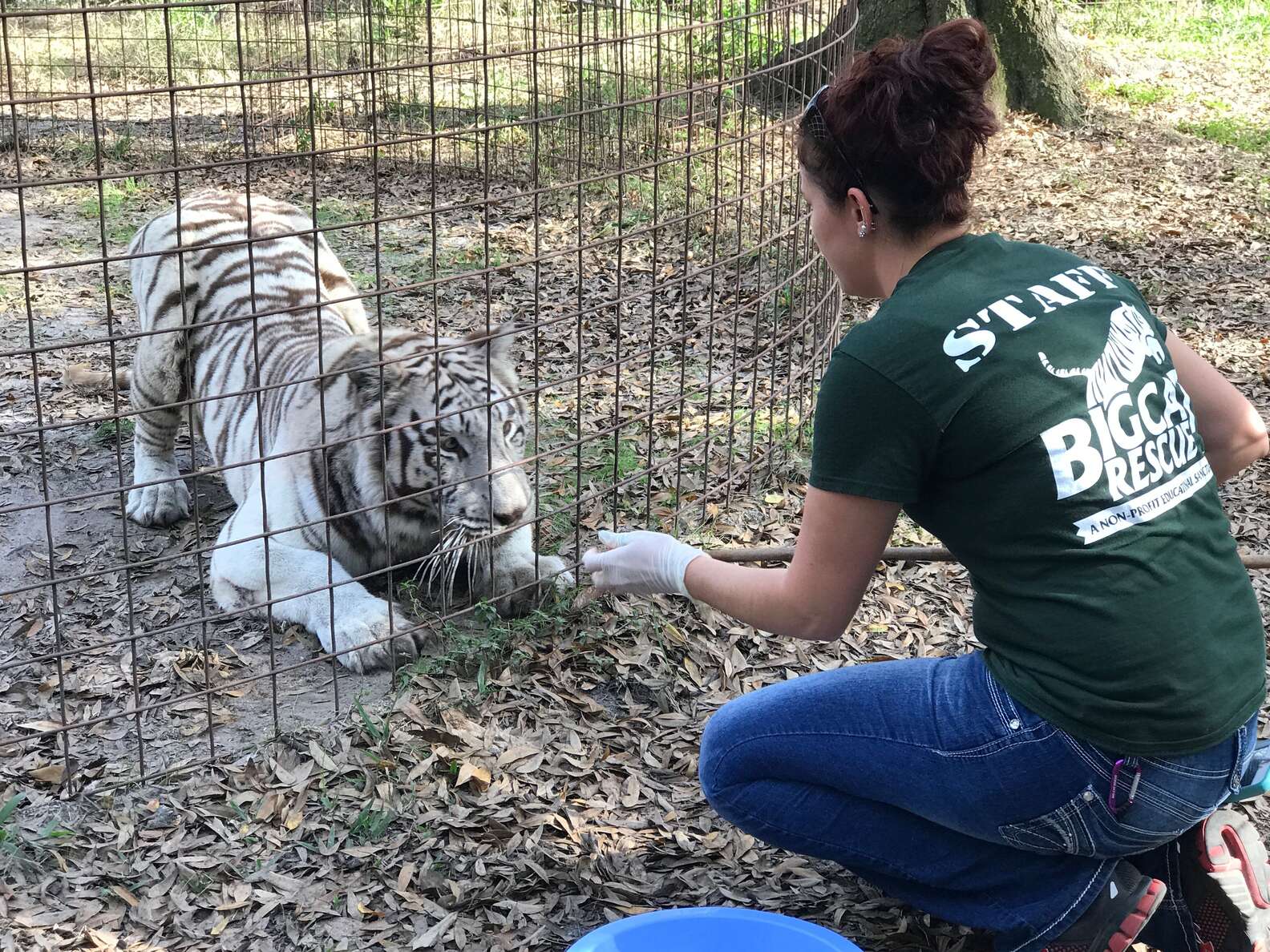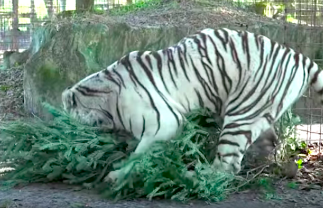 “She has crossed eyes like all white tigers, but her eyes are very noticeably crossed,” Bass said. “Sadly, she sometimes attacks her own back legs mistakenly thinking another tiger has snuck up behind her [because she can’t see properly].”