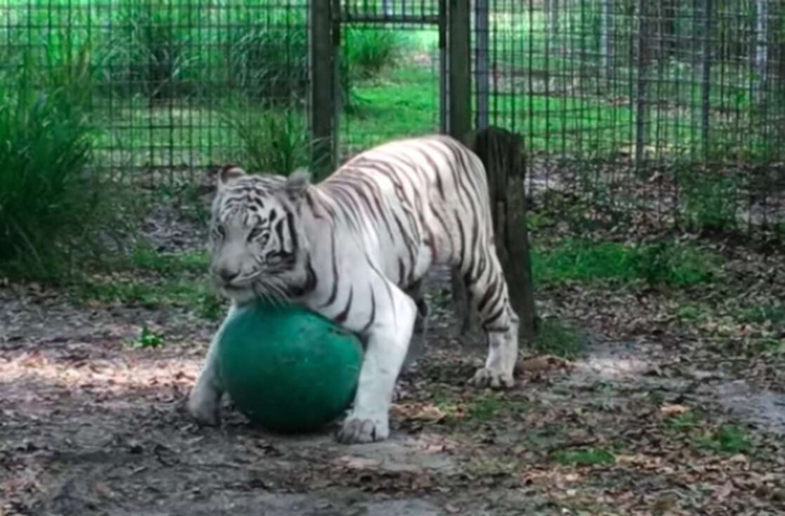 One adorably quirky thing that rescuers have learned about a white tiger named Sapphire is that she’s obsessed with her big red and green toy balls.