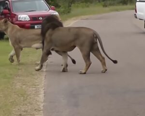 Tourists hanging out of their car at a lion sighting. This lion felt threatened and barked at the tourists. If he had decided to attack,