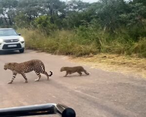 Yesterday, a leopard mom tried crossing the road but realized one cub was left behind, so she and her other cub went to fetch the